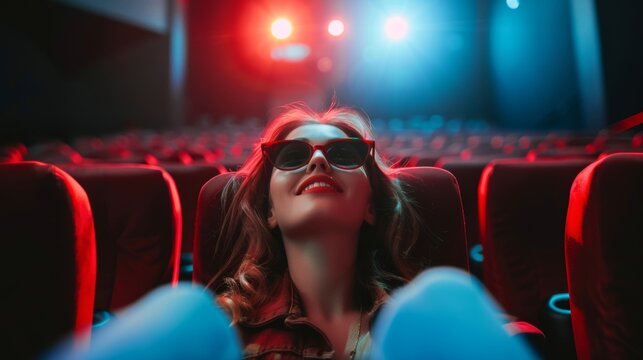 Young woman smiling with joy as she watches a movie in a cinema with red seats.