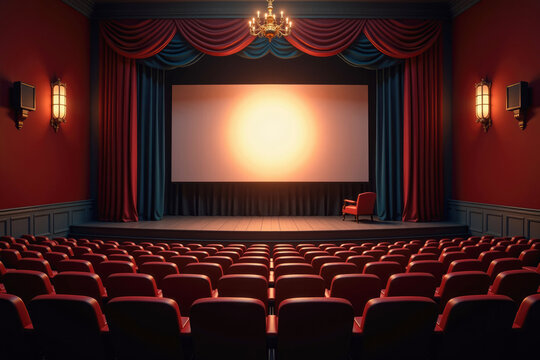 Silhouette of a man in a suit standing alone facing a large empty auditorium with rows of red seats under theater lighting