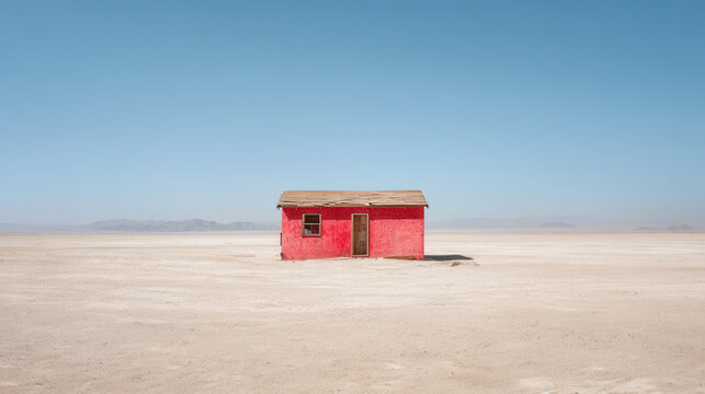 small, weathered red shack stands alone in a vast, barren desert under a clear blue sky, evoking solitude and resilience in a remote, sunbaked environment