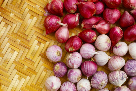Dried red chilies, small garlic bulbs, fresh cilantro leaves, and red shallots