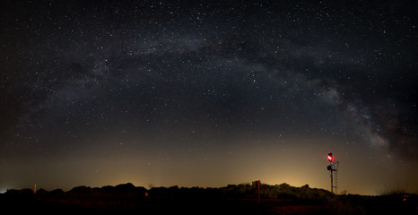 Illuminated red signal lantern casts a bright beam against dark night sky