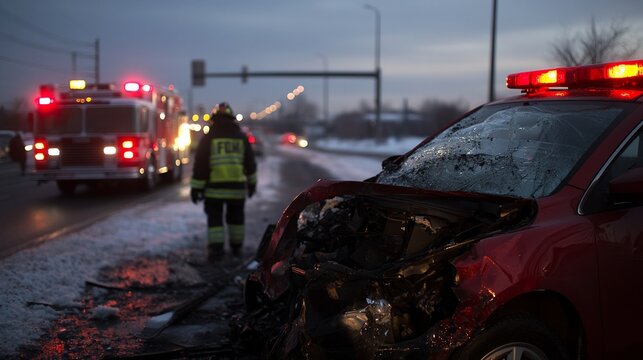 A red car with a smashed windshield sits on the side of the road with a fire truck in the background.