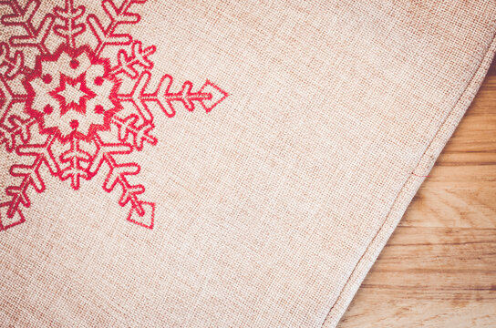 A red wooden Christmas tree with white patterns in the snow against a background of bright lights. Christmas atmosphere. Space for text. Minimalism.