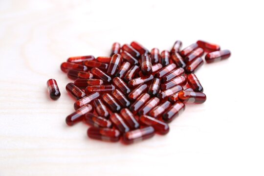 Live capsules with red solution on wooden board