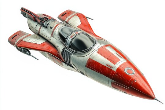 Red spaceship featuring a cockpit wings and a rear engine isolated on a white background