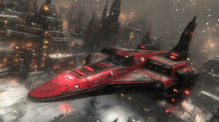 Red spaceship flying over snowy futuristic city at night.