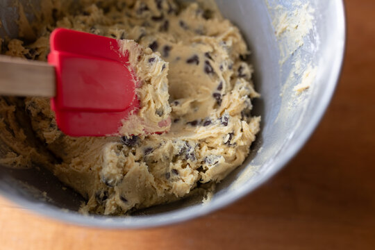 close-up homemade cookie dough on a red spatula and in a metal bowl