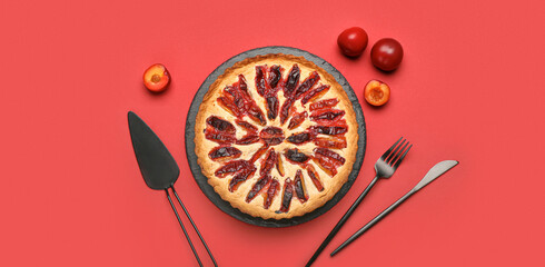 Frying pan with wooden kitchen and copyspace on red background