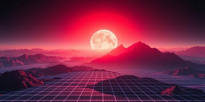 Futuristic digital landscape with glowing grid mountains and red sphere in sky, grid, landscape, mountains