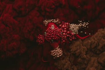 Group of small, round, red spheres floating in the air. the spheres appear to be spherical in shape and have a smooth, shiny surface.