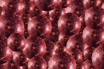 Red spheres on a textured background. Multiple red spheres arranged on a textured red background creating a pattern effect. AI generative.