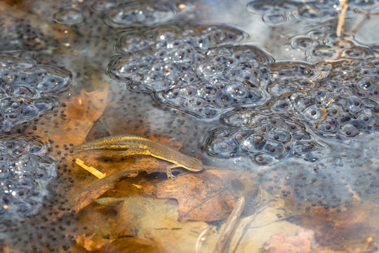 Red spotted newt preying on wood frog eggs - Notopthalmus viridescens