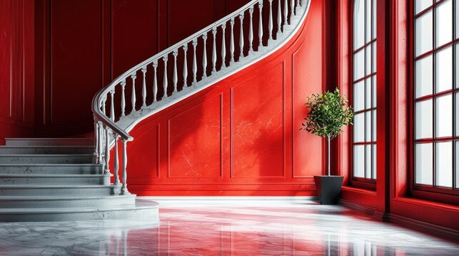 Sleek and modern red staircase curves elegantly in a luxury interior. Smooth lines and vivid color of a chic red staircase and interior space