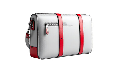 A chic handbag featuring white leather with red straps is showcased in a luxury boutique.