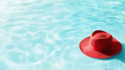 A vibrant red straw hat floats gracefully in a tranquil blue swimming pool, symbolizing relaxation, leisure, and the joy of summer days.