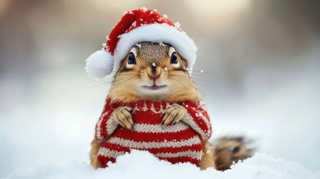 Adorable chipmunk wearing a red and white striped sweater and hat in the snow