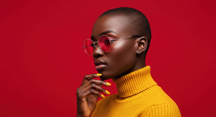 Elegant side-profile portrait of a woman in yellow turtleneck and matching manicure, posing thoughtfully against a vivid red studio background with minimal, modern styling