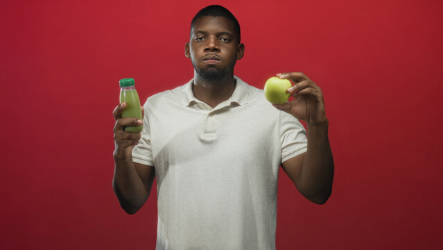 Man holding a green apple and a bottled green juice in his hands against a red studio backdrop, lips pressed in a slight smirk; confidence wellness choice.