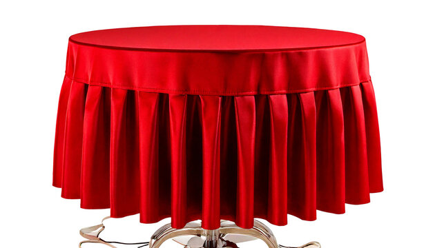 White wooden table covered with red tablecloth. View from top. Empty tablecloth for product montage. Free space for your text