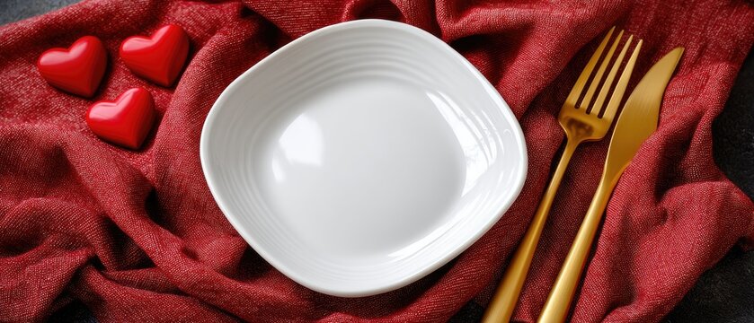Create a warm valentine's day setting with a white heart-shaped plate, golden fork, and red hearts on a bright red tablecloth for your friend