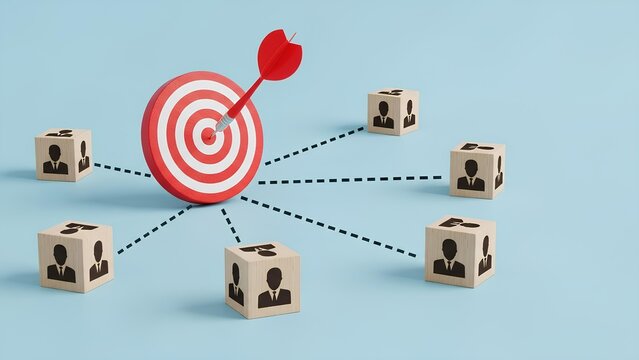 Business professional overseeing a diverse group of glowing human icons standing on illuminated red target circles representing customer focus and audience segmentation strategy