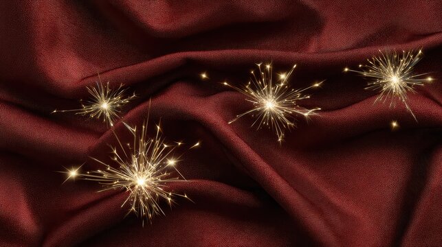 Bright Golden Sparklers Illuminating Luxurious Red Textured Fabric Background - Festive Celebration & Holiday Season Concept