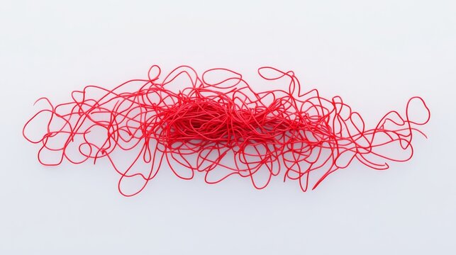 24.Detailed shot of a red thread knotted and tangled against a simple white backdrop, with loops and twists forming an intricate pattern, symbolizing confusion and complexity.