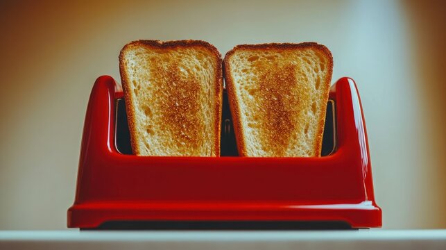 Flying toast: pieces of bread float above a red toaster, creating a dynamic and appetizing breakfast scene.
