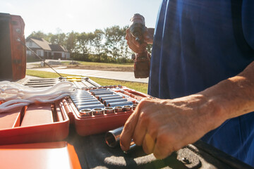 A man in coveralls, holding a red toolbox filled with tools, displays a surprised expression against a vibrant red backdrop.