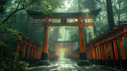 A serene pathway through vibrant red torii gates in a lush forest, under a misty sky, leading to a mystical Japanese shrine.