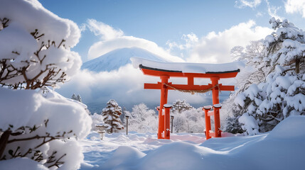 Beautiful red torii gate in a snowy landscape with a majestic mountain in the background, blue sky, and white clouds.