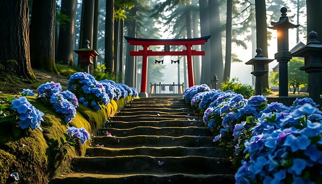 Misty Forest Path with Hydrangeas Ascending to a Red Torii Gate