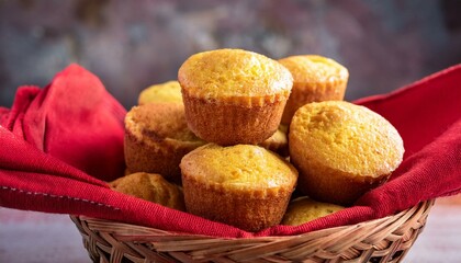 tiny cornbread muffins in a red towel lined basket in the front of a black heritage
