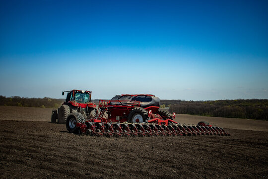 Red tractor with  planter sowing corn on the field