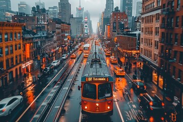 Historic street with colorful buildings and red tram in Prague city center, Czech Republic. g.