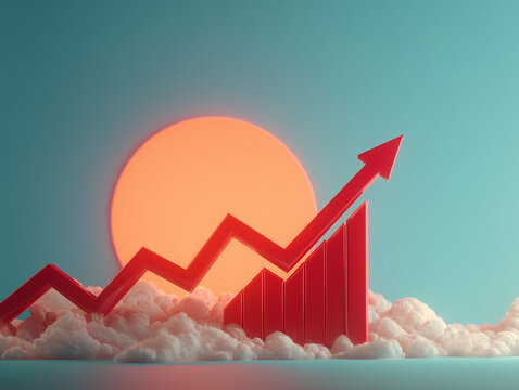 Red market arrow soaring over cloud layer at sunrise, 3D render