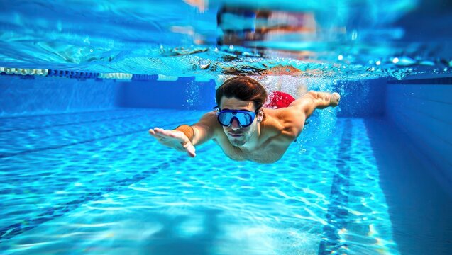 Man swimming underwater in a pool with goggles and red trunks