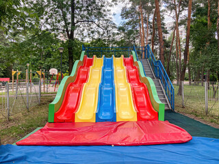 Vibrant three-tiered slide in a park playground Bright red, yellow, and blue design Protective blue tarp under slide Sturdy metal fence to the right Lush green trees in background Daytime lighti