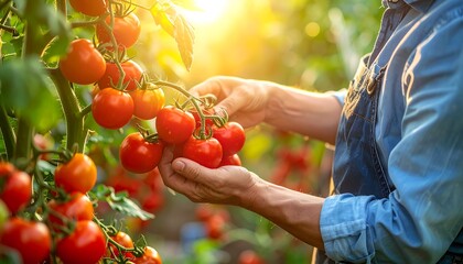 Close-up of a farmer harvesting ripe, red tomatoes from a vine in a sun-drenched greenhouse. The warm light creates a beautiful glow