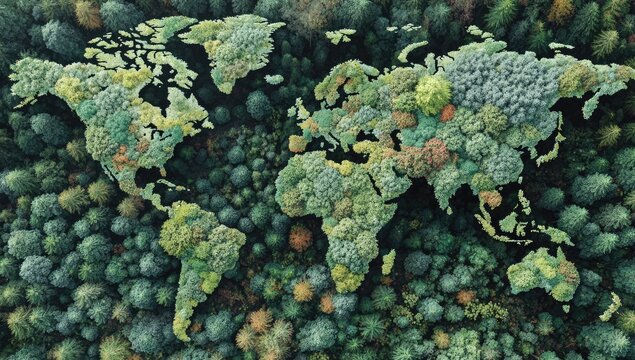 World map overlaid on forest canopy