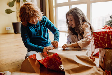 A White school-age boy with red hair and his younger sister are excitedly opening Christmas presents together, while surrounded by holiday decorations and red wrapping paper on the Christmas morning.