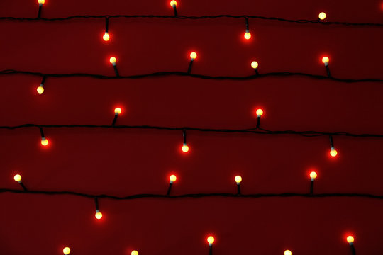 Christmas background. Beads and garland on a red background