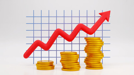 3D financial graph, red zigzag, gold coin stacks, blue grid, minimalist