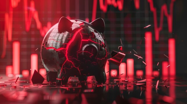 A cracked piggy bank with dim lighting and a falling red graph in the backdrop, front view, indicating financial trouble, technology tone, monochromatic color scheme