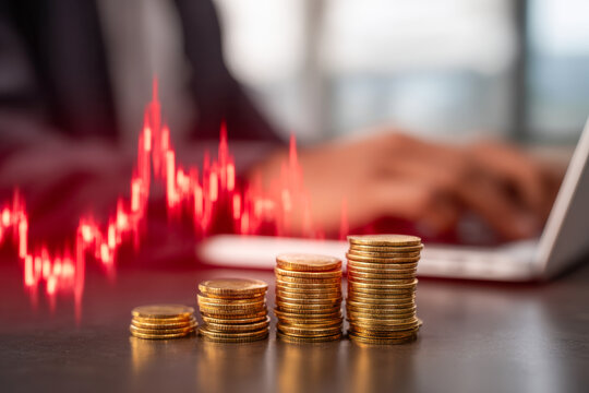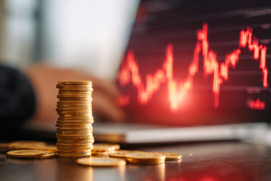Stack of golden coins on a desk with a person working on a laptop and a glowing red financial market graph in the background representing investment and economic analysis
