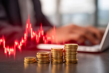 Stacks of coins increasing in height symbolizing financial growth with a blurred background of a person using a laptop and a red digital market graph displayed nearby