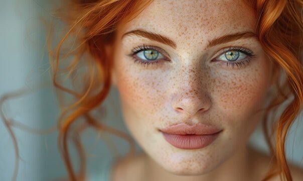 A young redhead with a sprinkling of freckles across her skin exudes a sensual aura.