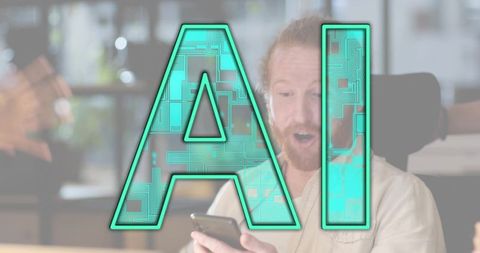 Turquoise ai overlay revealing excited man checking smartphone in open office workspace