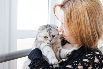 Beautiful girl with redheads hair playing with a gray cat