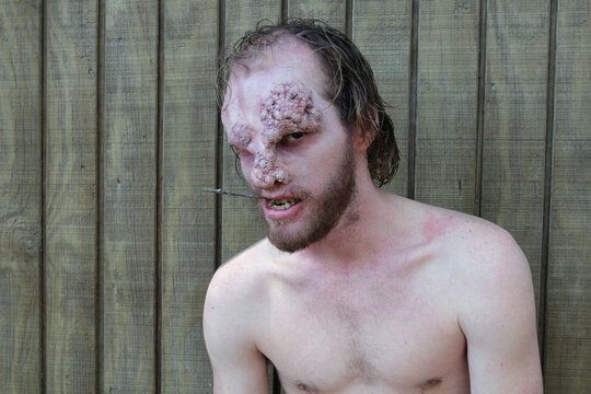 Serious white male activist protesting outdoors with group of demonstrators in the background.